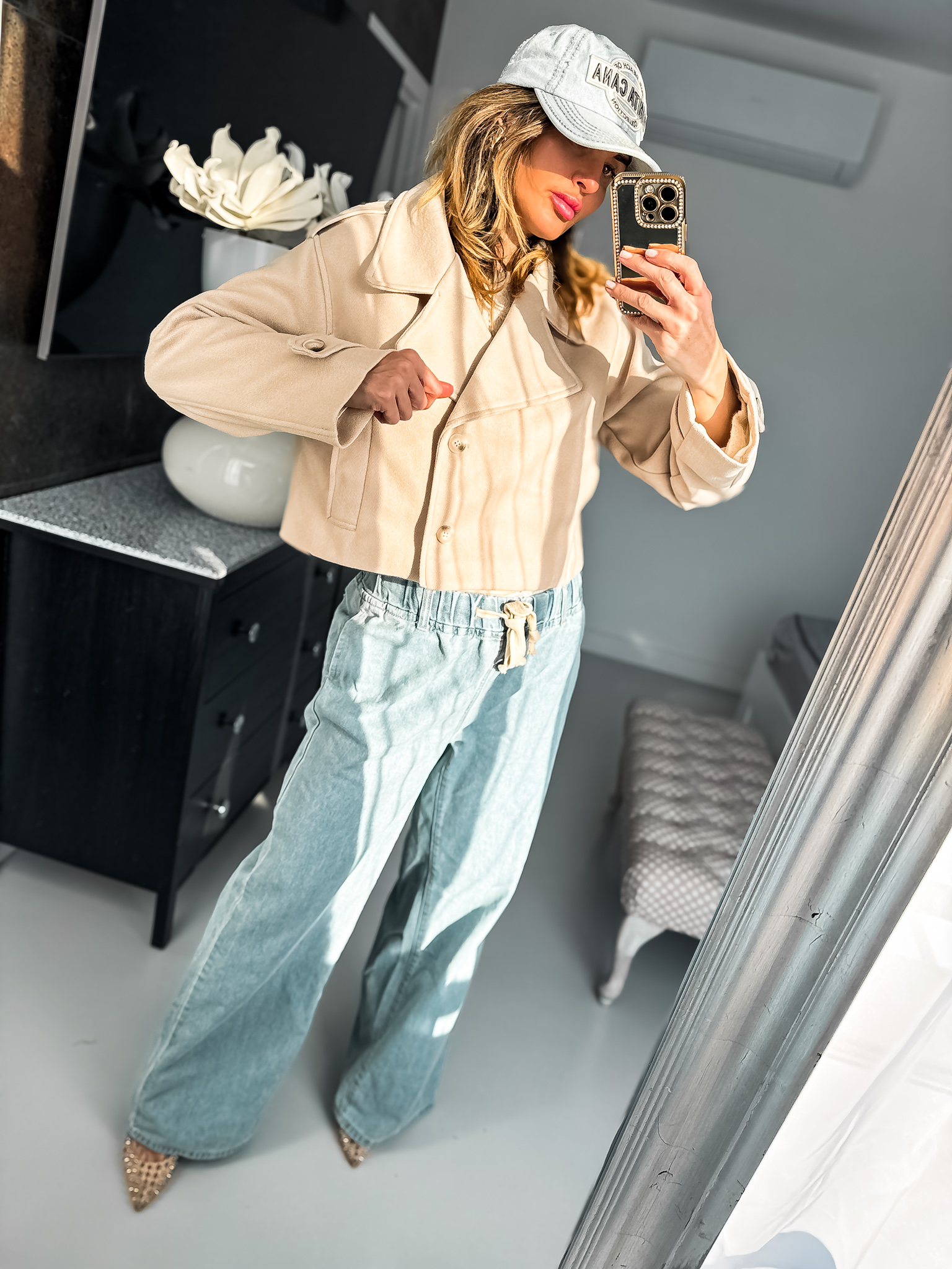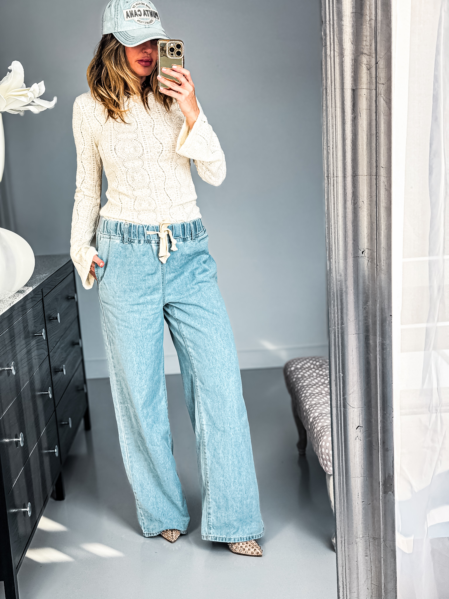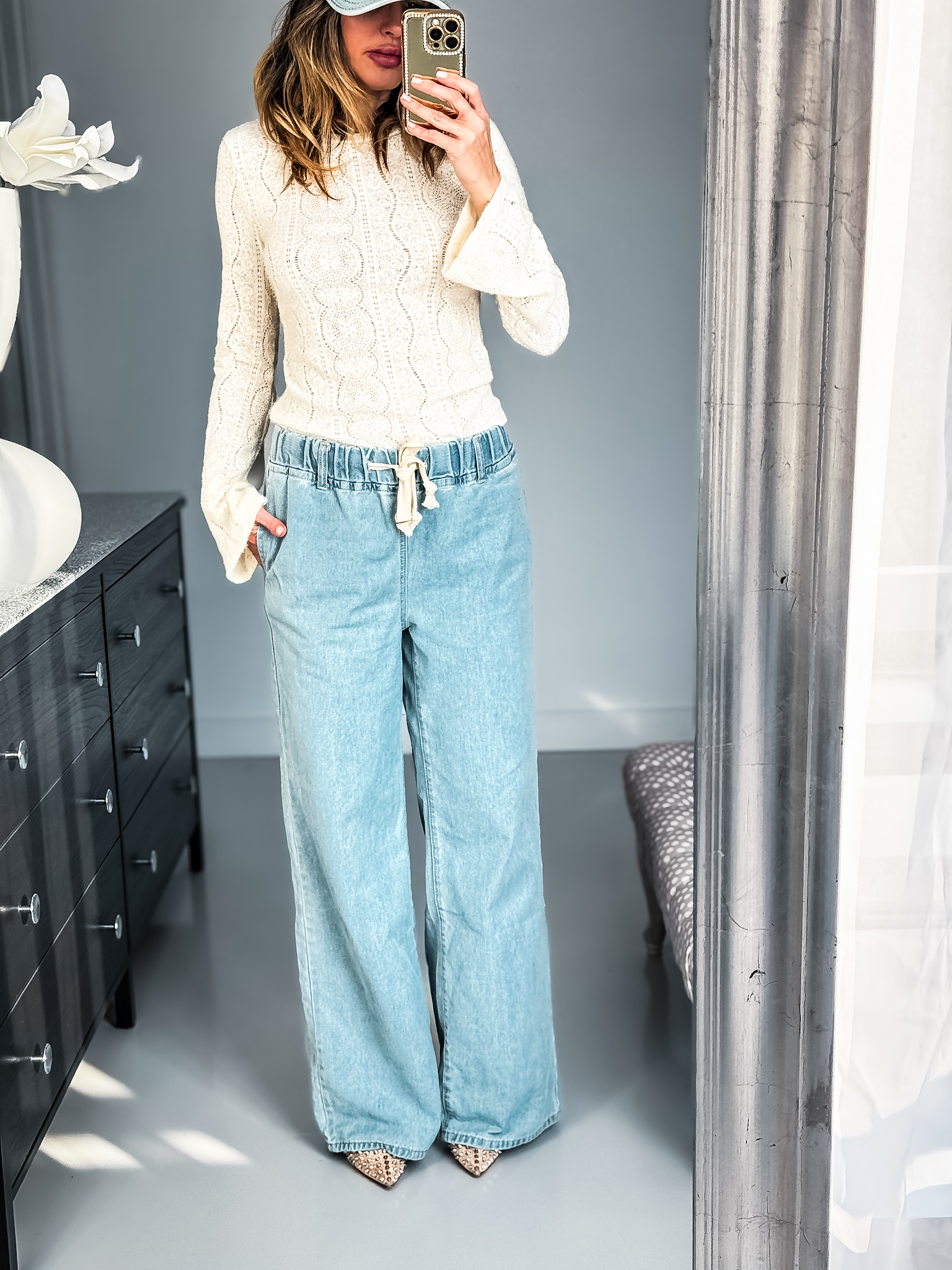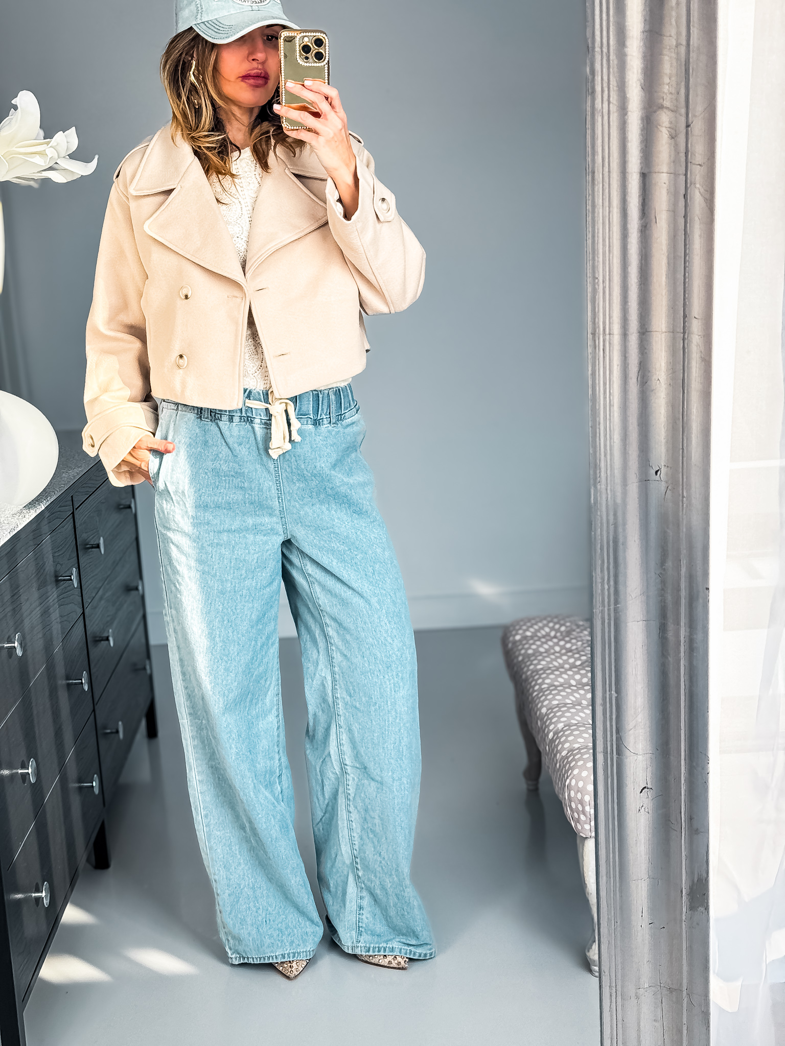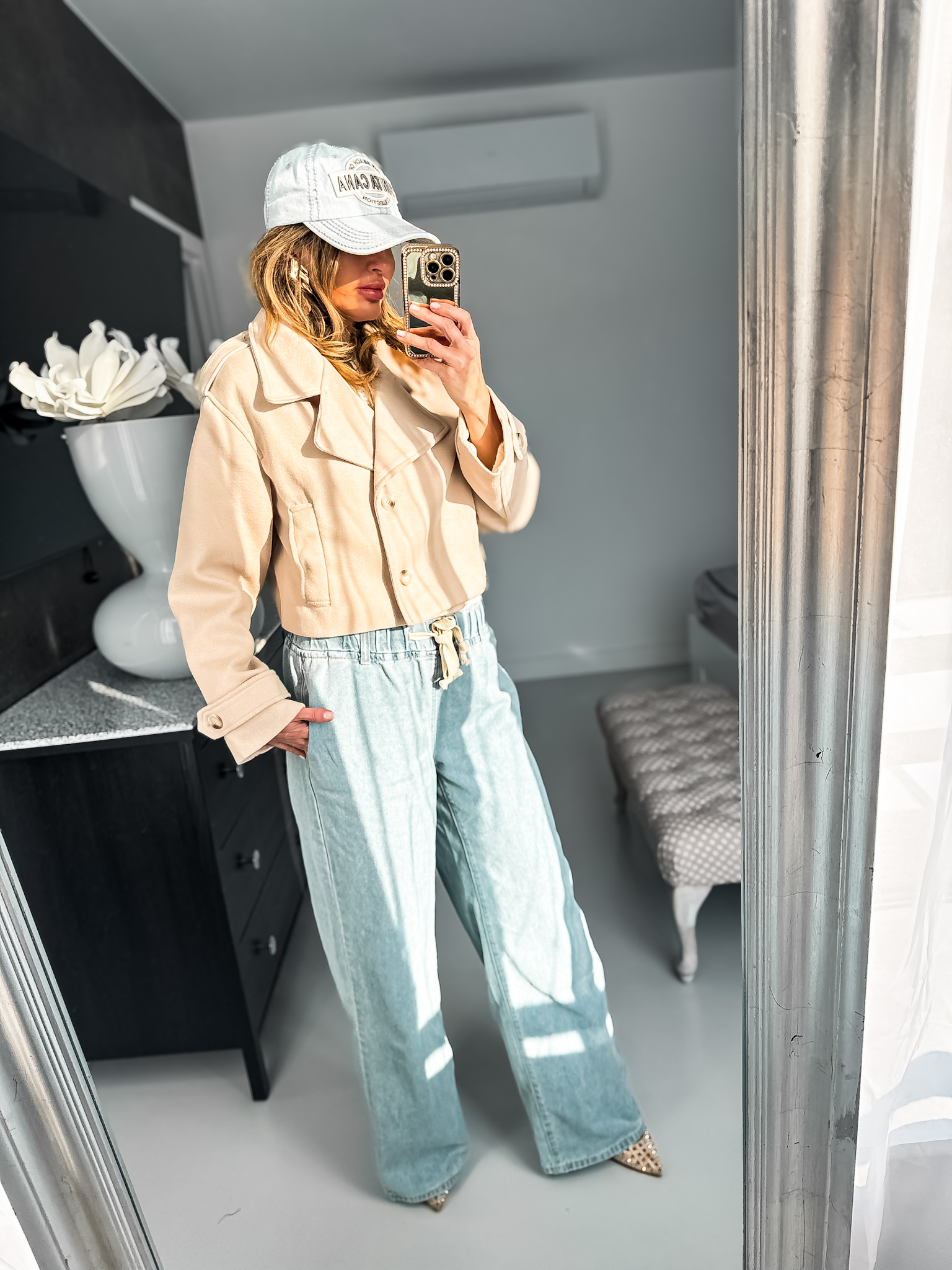 Prezentowany model został wykonane z TKANINY jeansowej cieńszej miękkiej z gumką dzięki temu ladnie się układają tkanina jest miękkiej i przewiewna co zapewnia komfort noszenia. Spodnie są w pięknym jasnym kolorze wycierane maja pięknie skrojony fason są szerokie i wyszczuplają sylwetke , ilość limitowana . Zaprezentuje się zjawiskowo w zestawieniu z ramoneską i ulubionymi botkami.