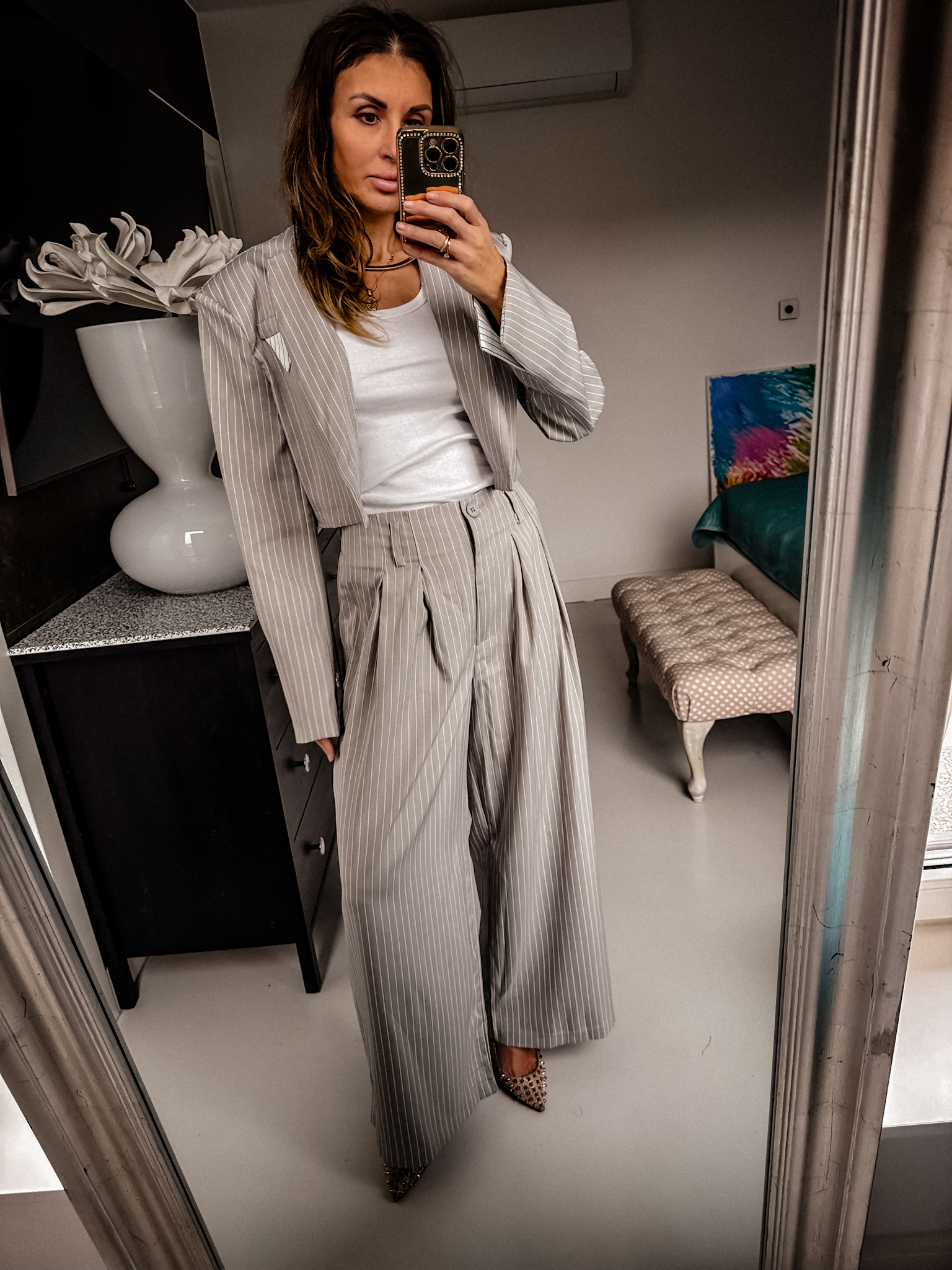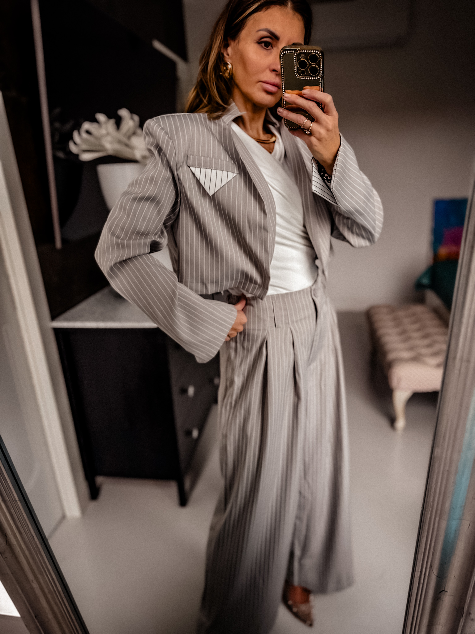 Komplet składa się z marynarki i szerokich spodni posiadają gumkę w talii sa wygodne i tkanina garniturowa ładnie się układa piękny kolor marynarka na poduszkach fason pudełkowy