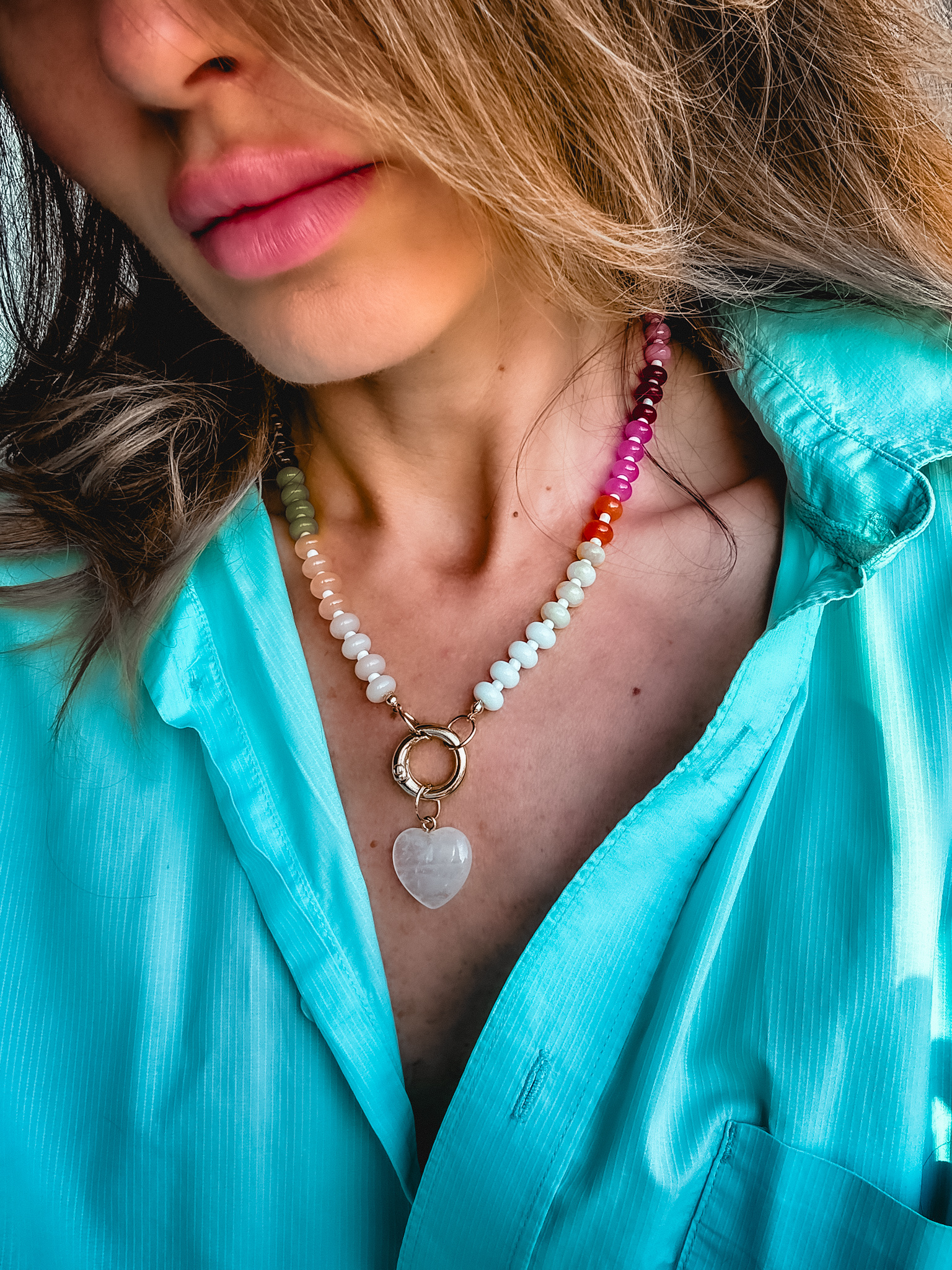 Naszyjnik jest prześliczny kolorowy z końcówką serce pół przezroczyste cudowny kamień na końcu jest złoty nie uczula jest ze stali nierdzewnej kolor złoty