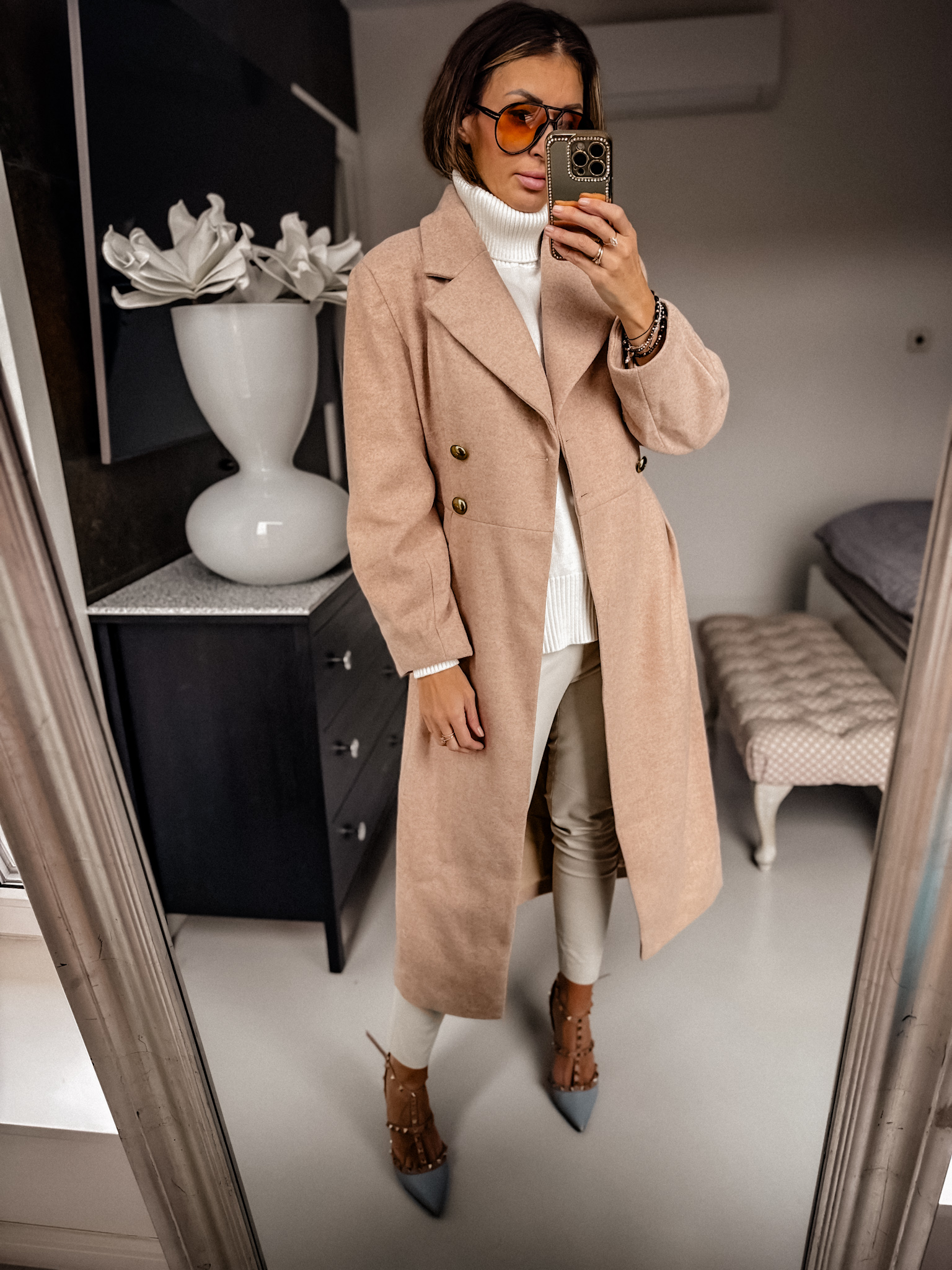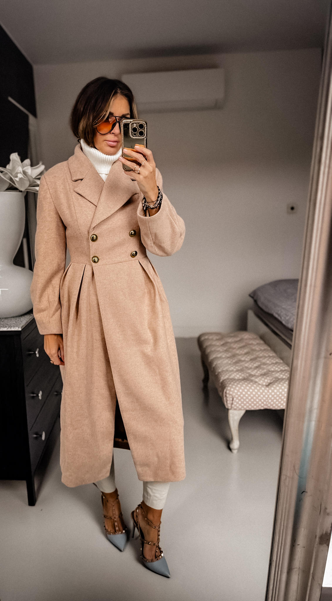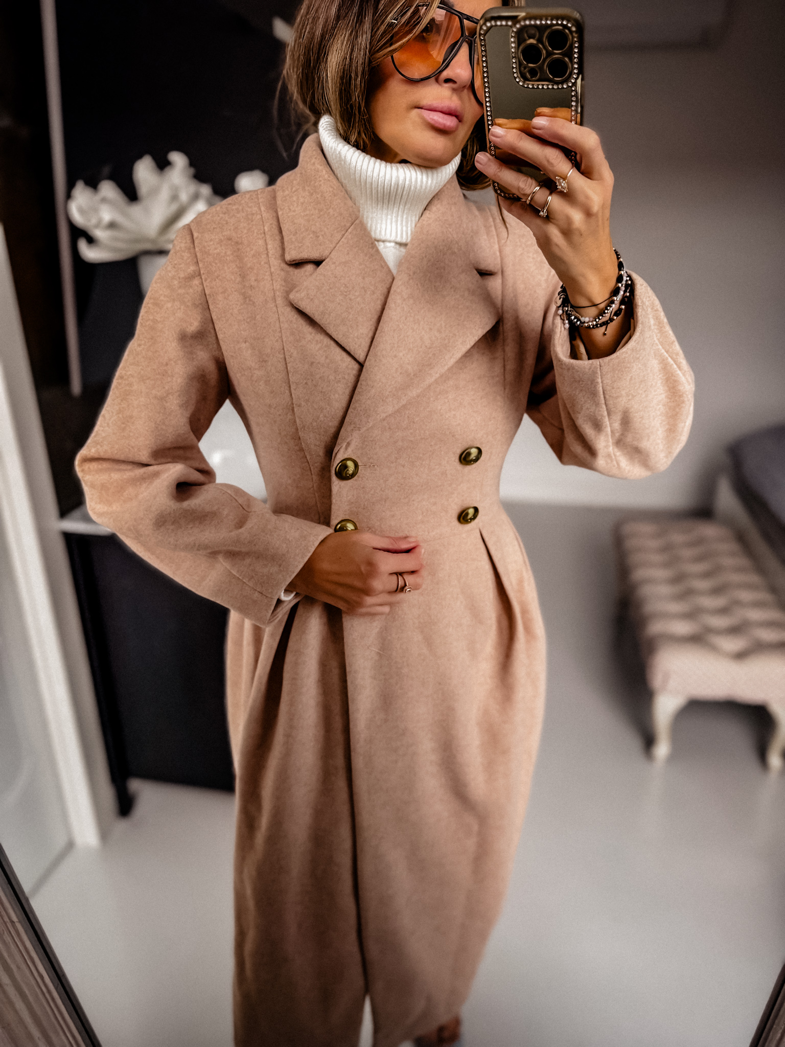 Płaszcz z wełną bardzo ciepły piękny fason luźny ale jest pasowany w talii jest zapinany na guziczki ma podszewkę i tkanina jest lekka i ciepła idealny na mrozy