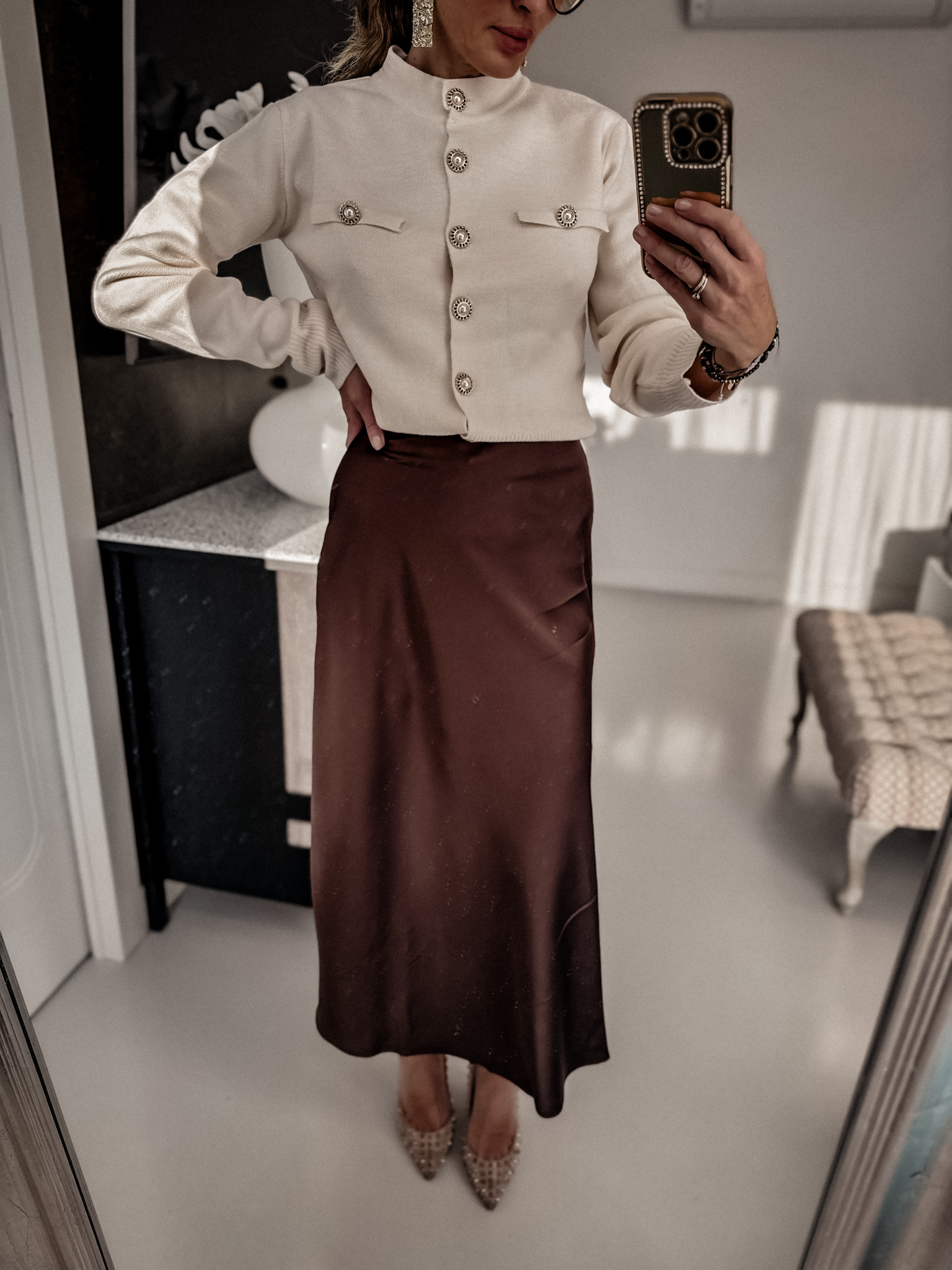 Spódnica jest dopasowana u góry poszerzana ku dołowi , idealna dla każdej sylwetki jest bardzo elegancka tkanina satynowa bawełniana lecz nie swieci się jak typowa satyna w talii jest elastyczne