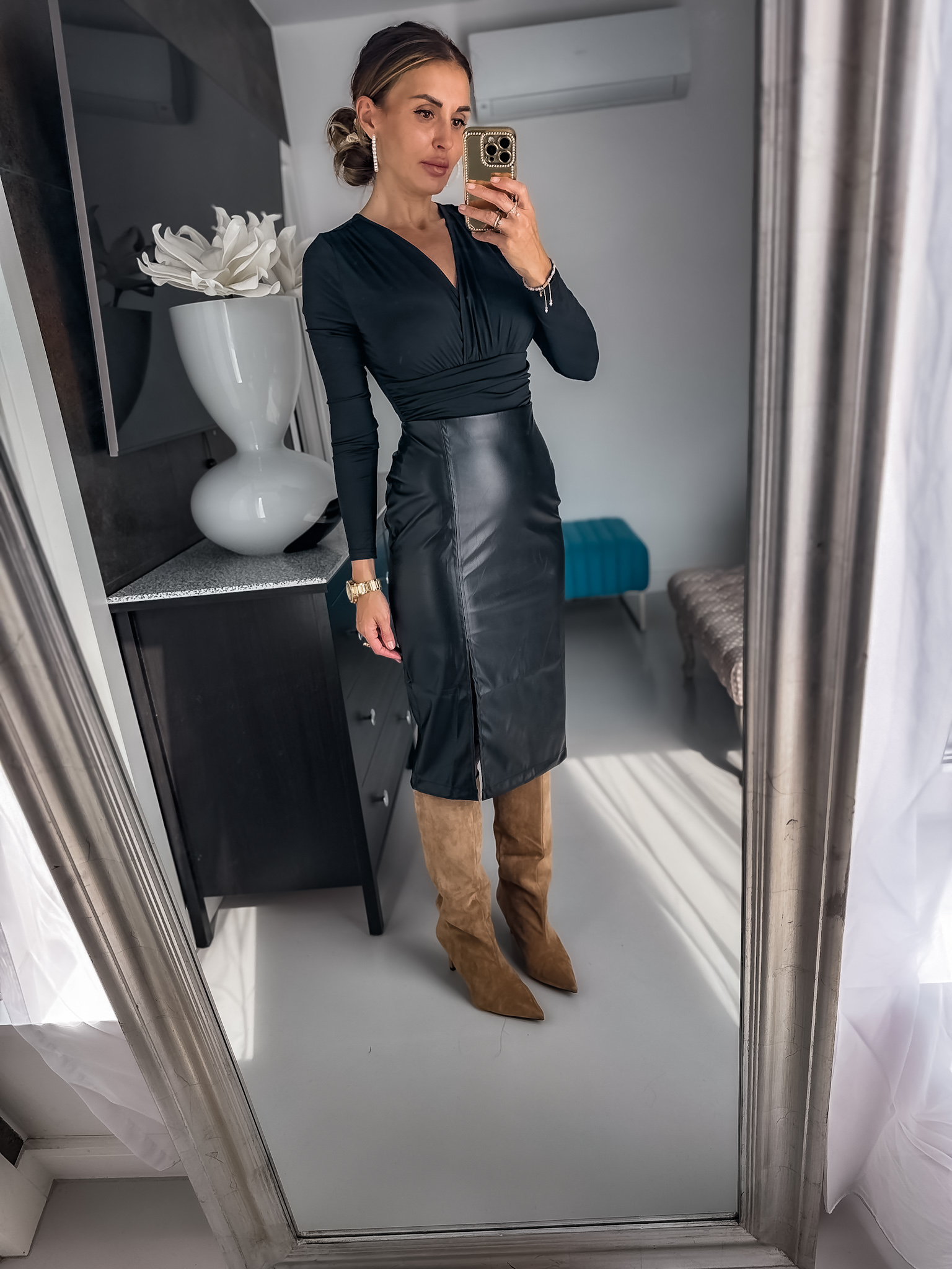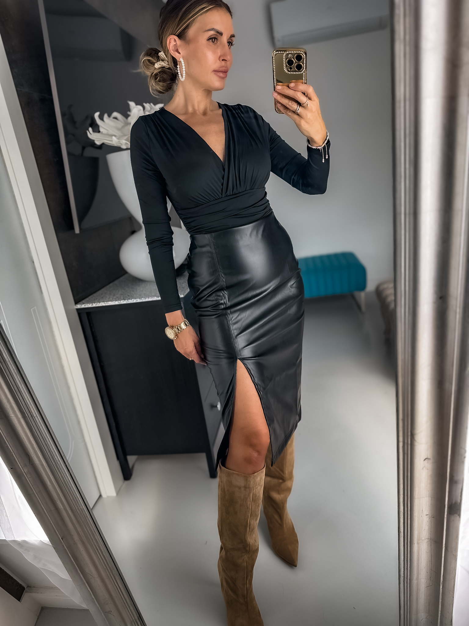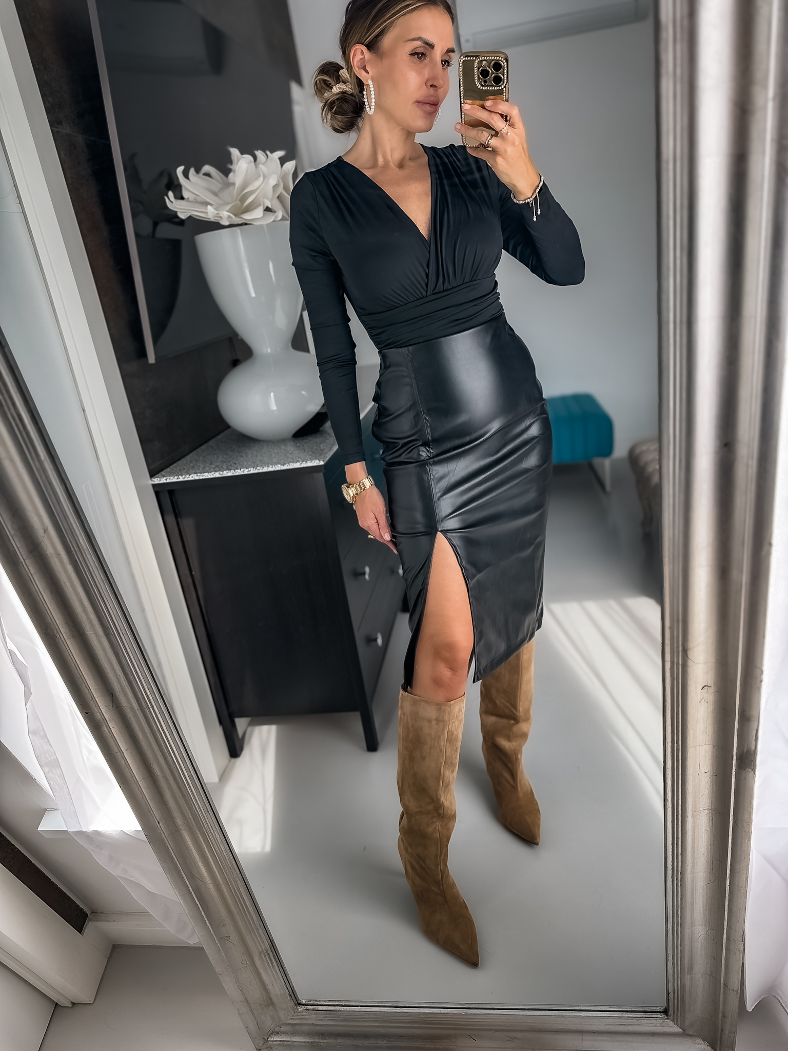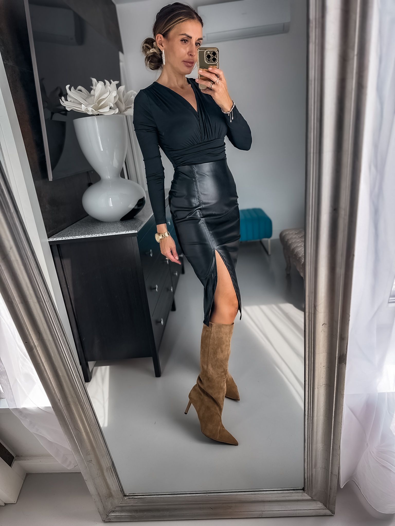 Spódnica z Eco skóry tkanina elastyczna na podszewce ma gumkę w talii jest elastyczna przepięknie podkreśla sylwetkę ma wysoki stan wyszczupli brzuch w talii