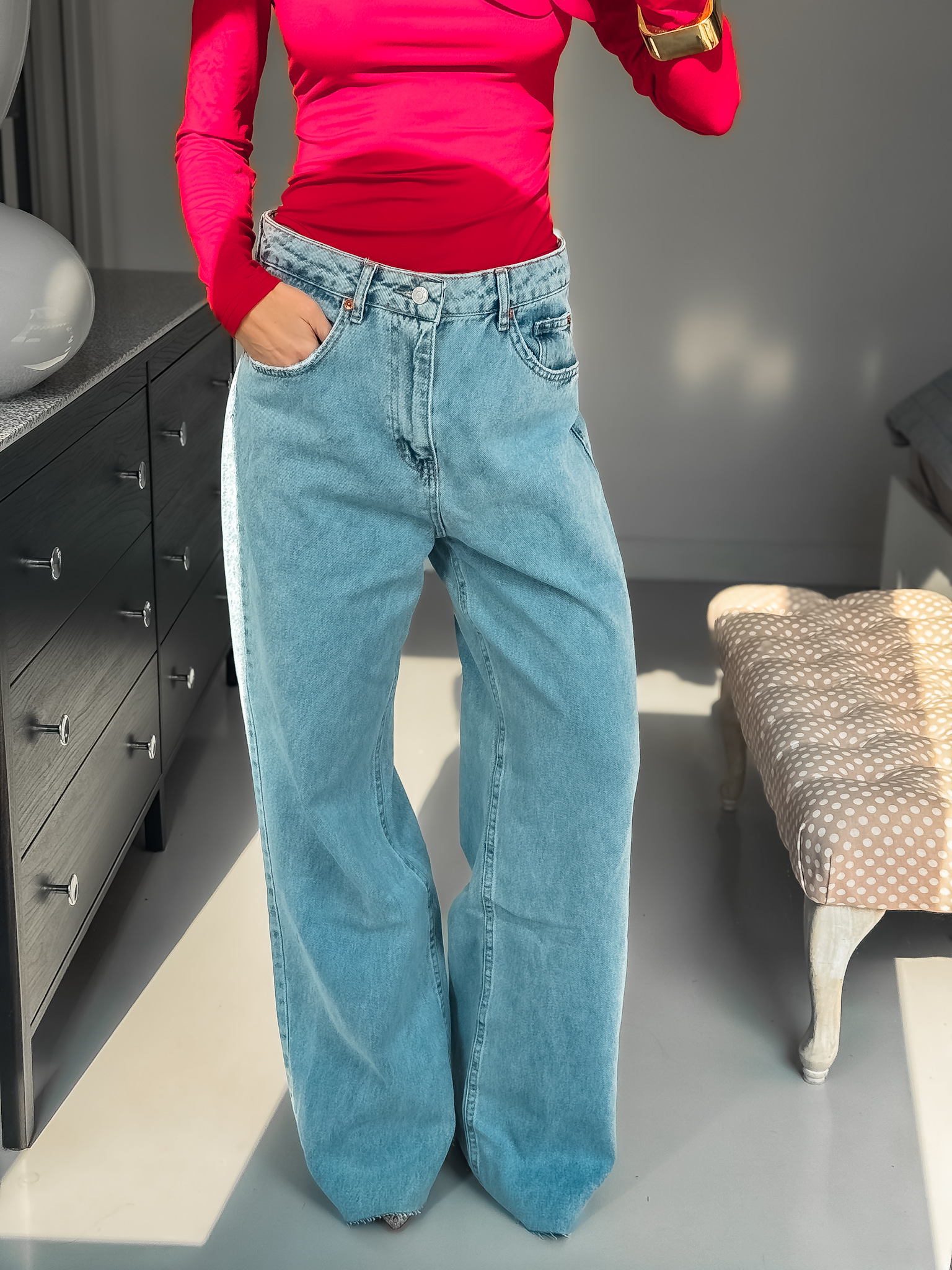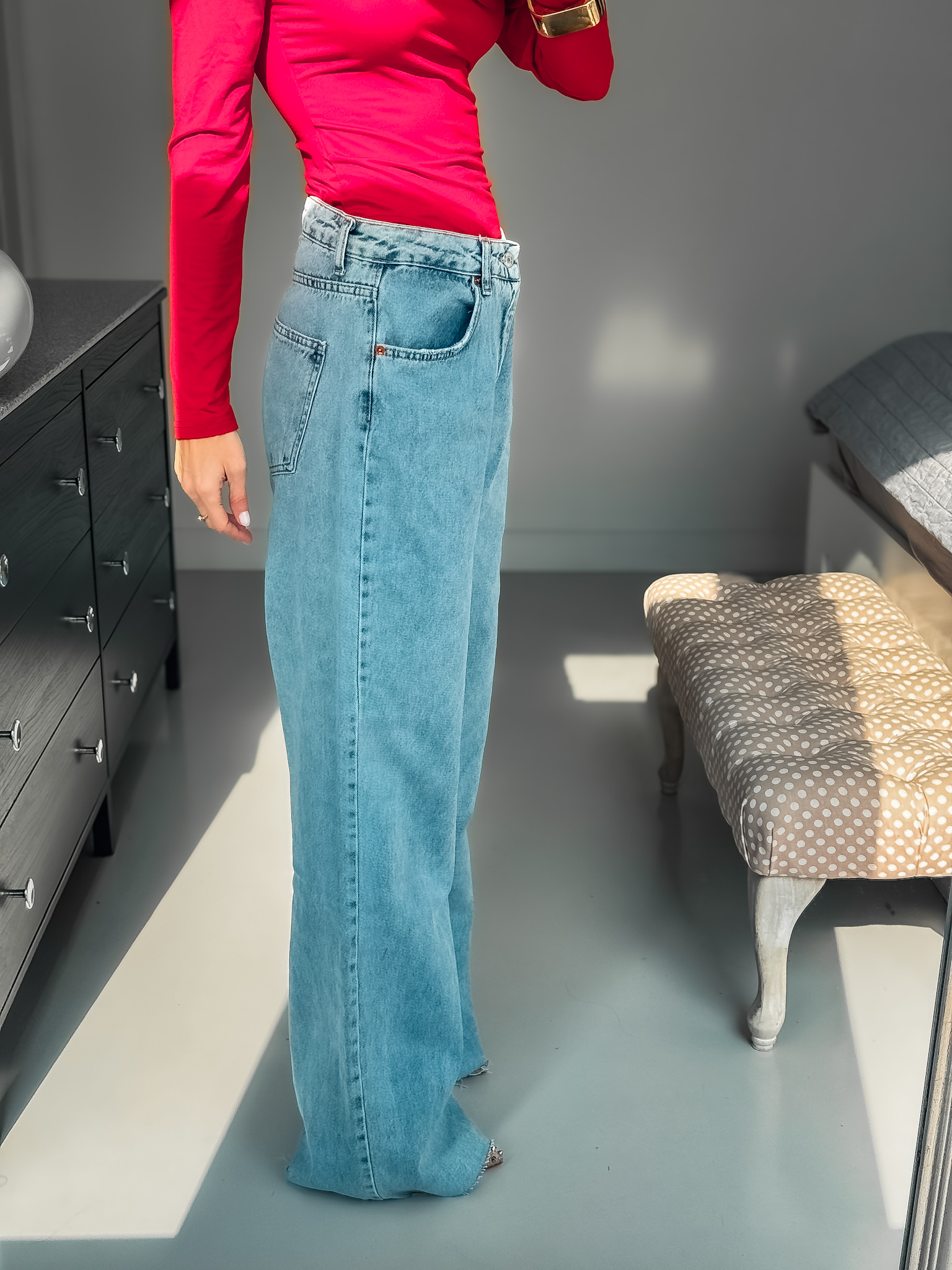 Jeansy są niesamowicie wygodne miękkie bardzo fajne w noszeniu ładnie wyszczuplają nogi bo są szerokie od góry nogawki Tkanina cieńsza z elastanem jeansowa w jasnym niebieskim kolorze wycierane z niskim stanem i niezwykle wygodne w najmodniejszym w tym sezonie