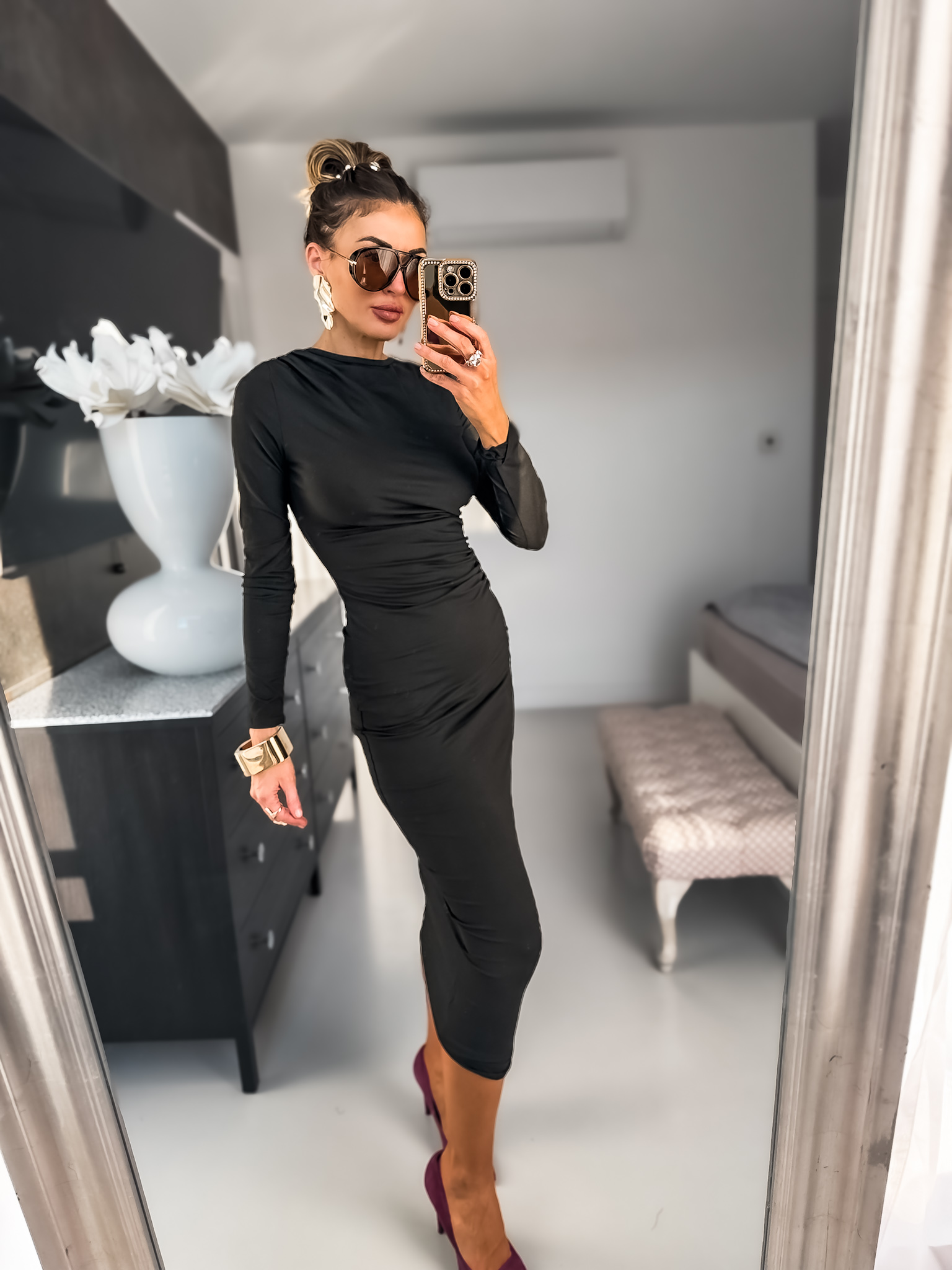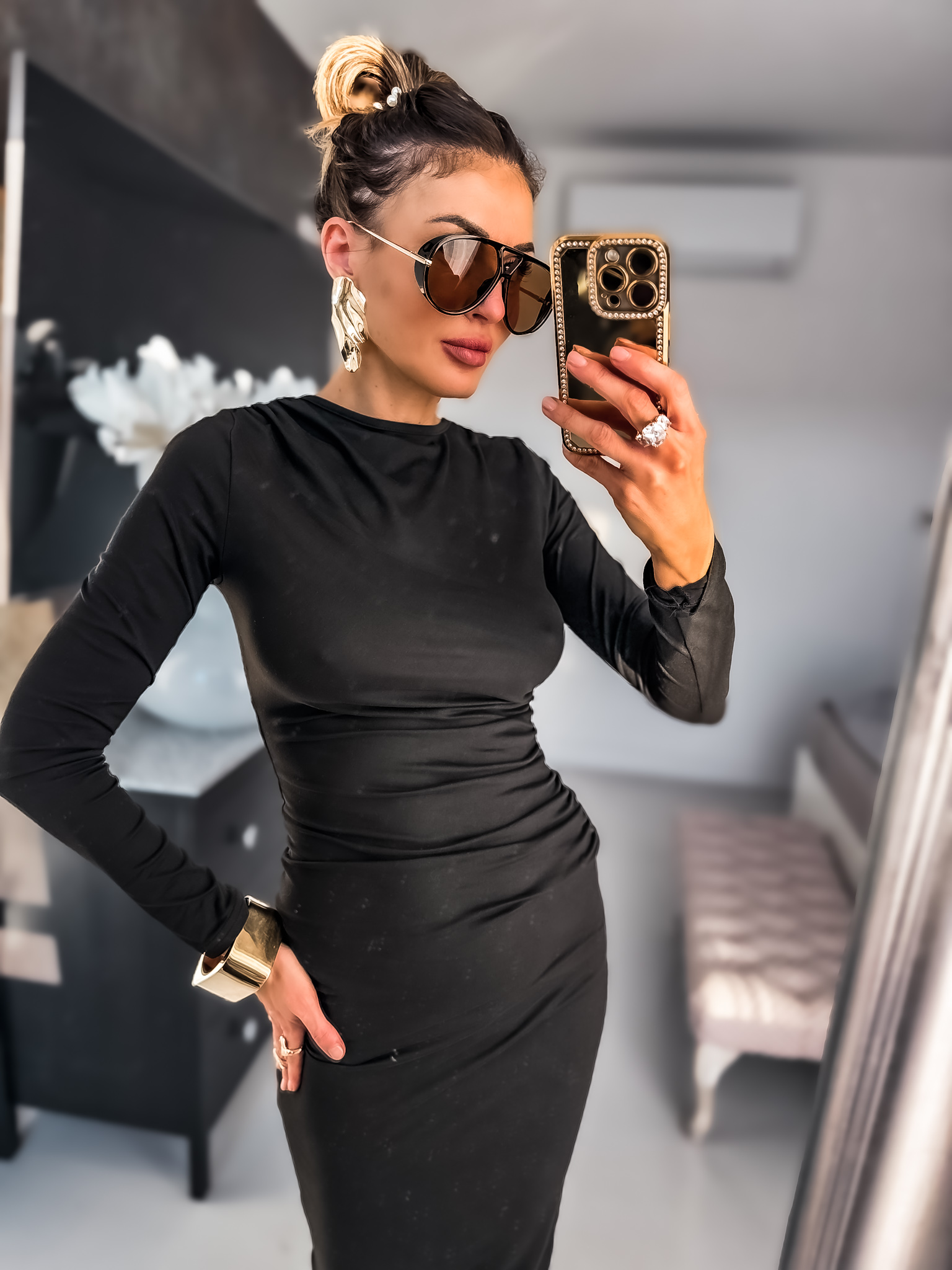 Sukienka z dzianiny soft wyjątkowo miękka tkanina i elastyczna dopasowana jest lżejsza i przyjemna w dotyku posiada marszczenie na brzuchu i ramionach który ładnie wyszczupla brzuch i zakrywa dopasowana górę i tkanina jest bardzo elastyczna i miękka jest wygodna w noszeniu można ją nosić też do grubych rajstop