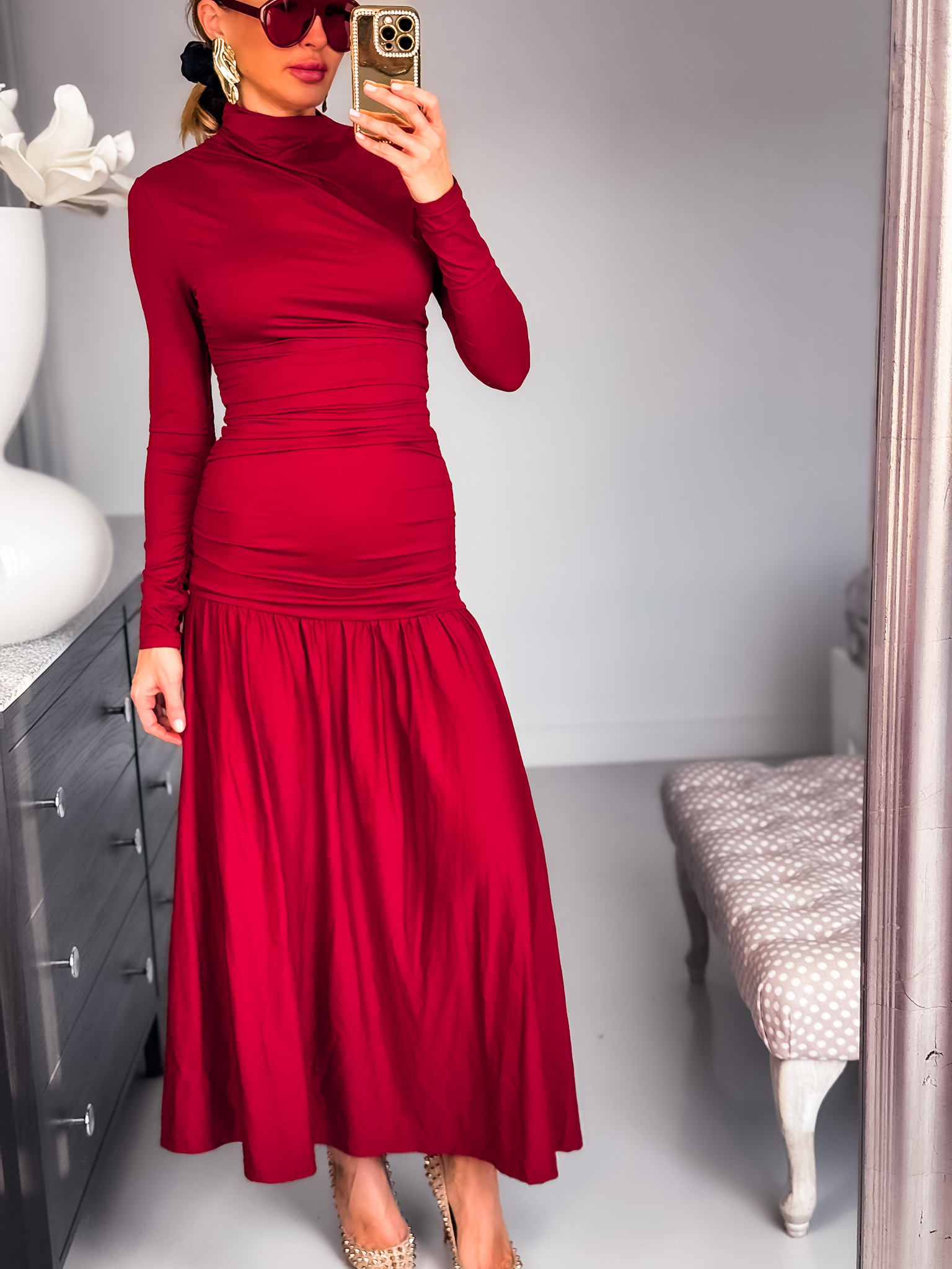 Sukienka z elastyczna tkaniny bardzo elastyczna posiada dopasowaną górę oraz marszczony dół który jest marszczony prześliczny elegancki model jest też bardzo wygodna tkanina ity lejąca i cieńsza idealna do klapek i do też do wysokich obcasów wyszczupla talię ją nosić też do grubych rajstop sukienkę można skrócić lub wydłużyć dzięki marszczeniom po całości