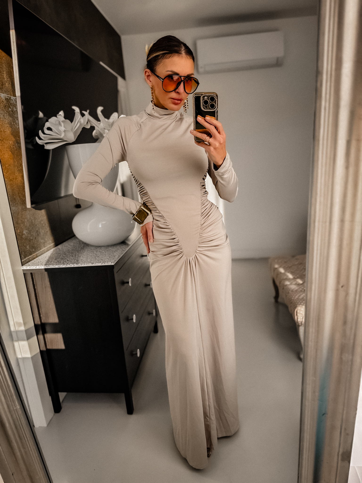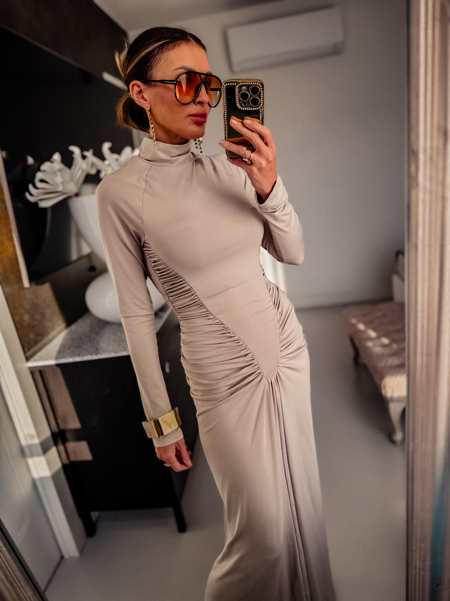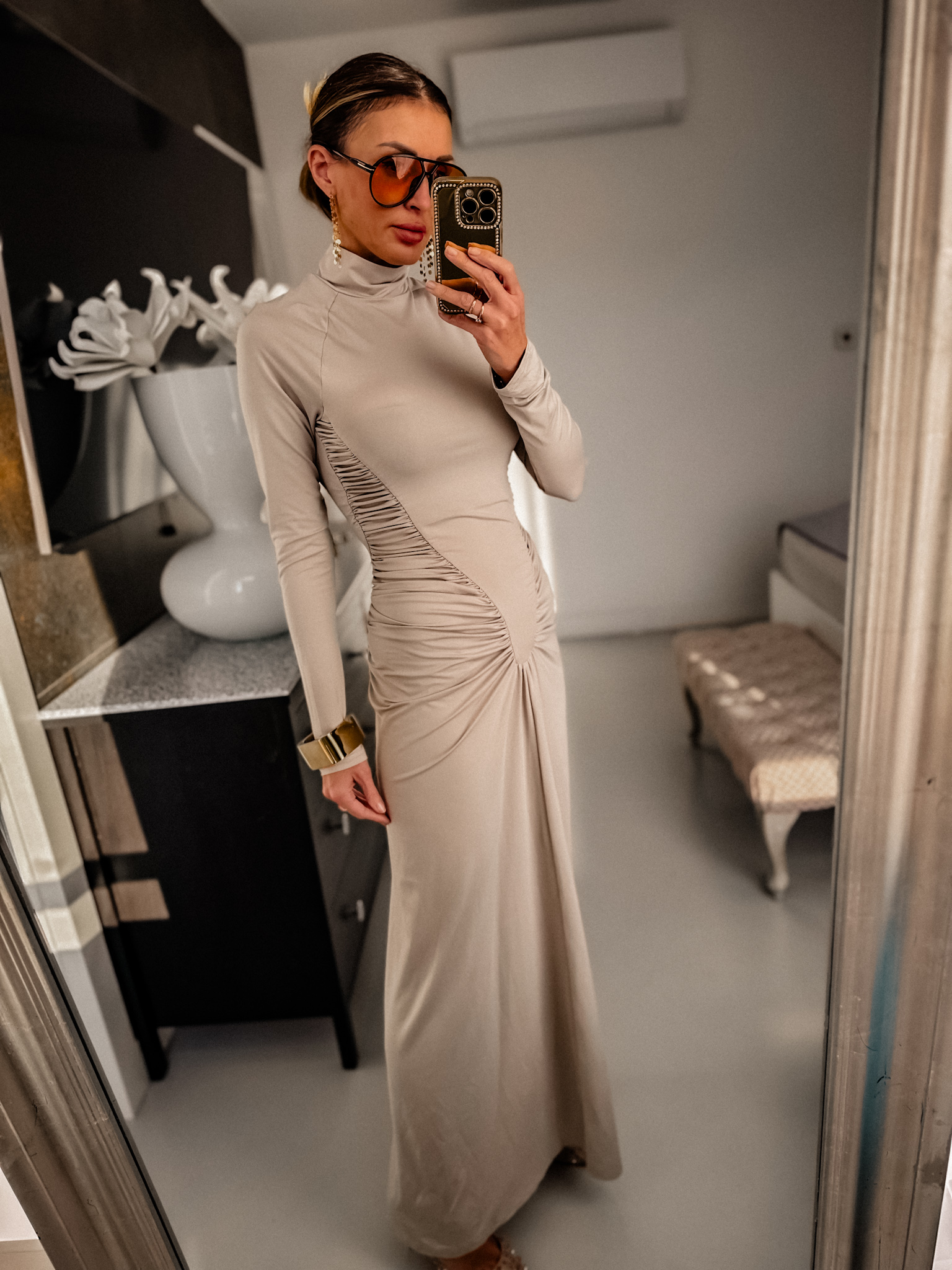 Przepiękny model w kolorze gołębim wykonany z tkaniny bardzo elastycznej miękkiej i wygodnej piękne marszczenie po bokach i asymetryczny przód