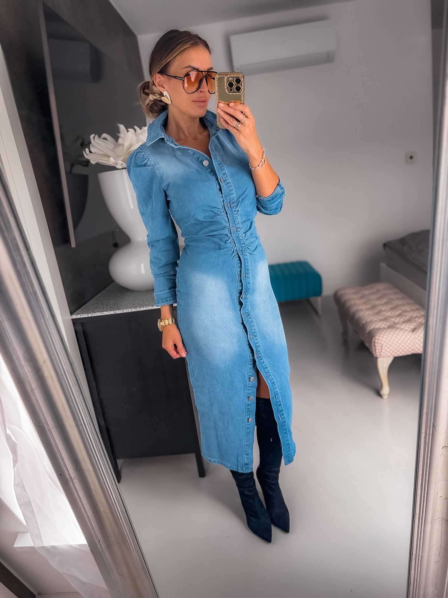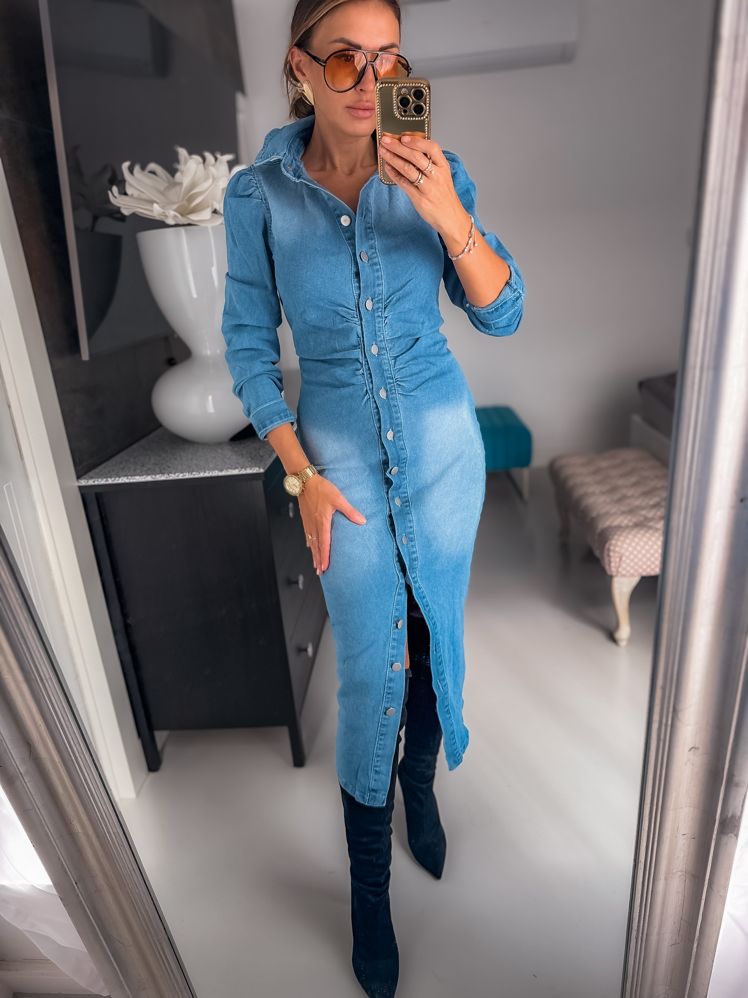 Sukienka koszulowa jeansowa super miękka zapinana na guziczki dół jest dopasowany tkanina ma dużo elastanu podkreśla talię jest super Wygodna sukienka fason elegancki idealny do rajstop