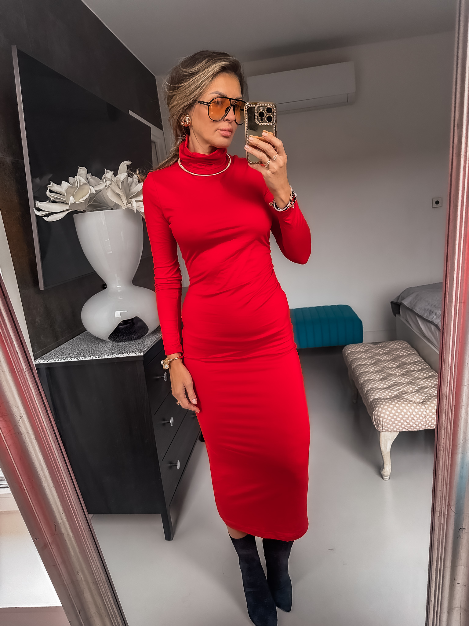 Sukienka z tkaniny super soft bardzo miękka i delikatna w dotyku fason dopasowany kolor czerwony golf jest luźny nie uciska a tkanina bardzo mocno się naciąga