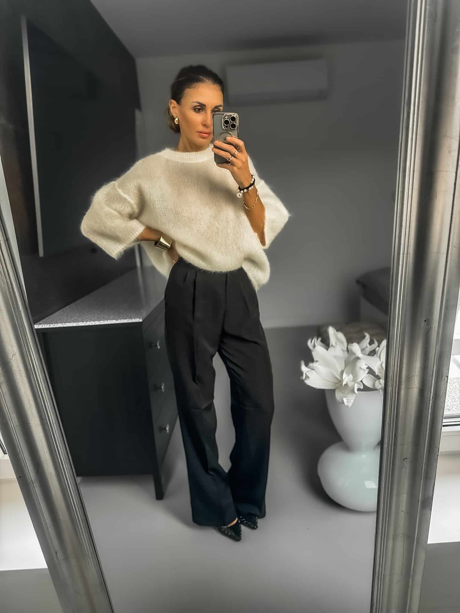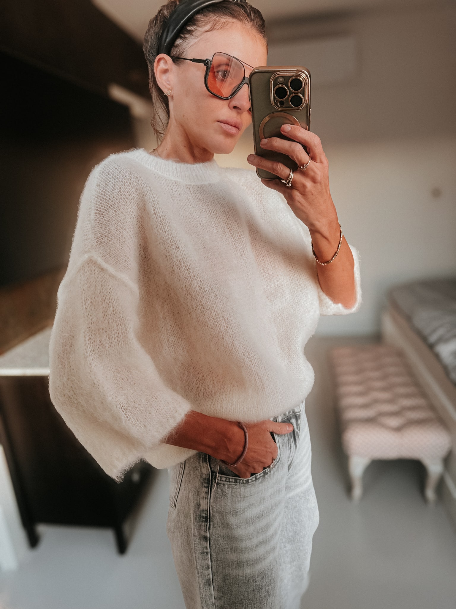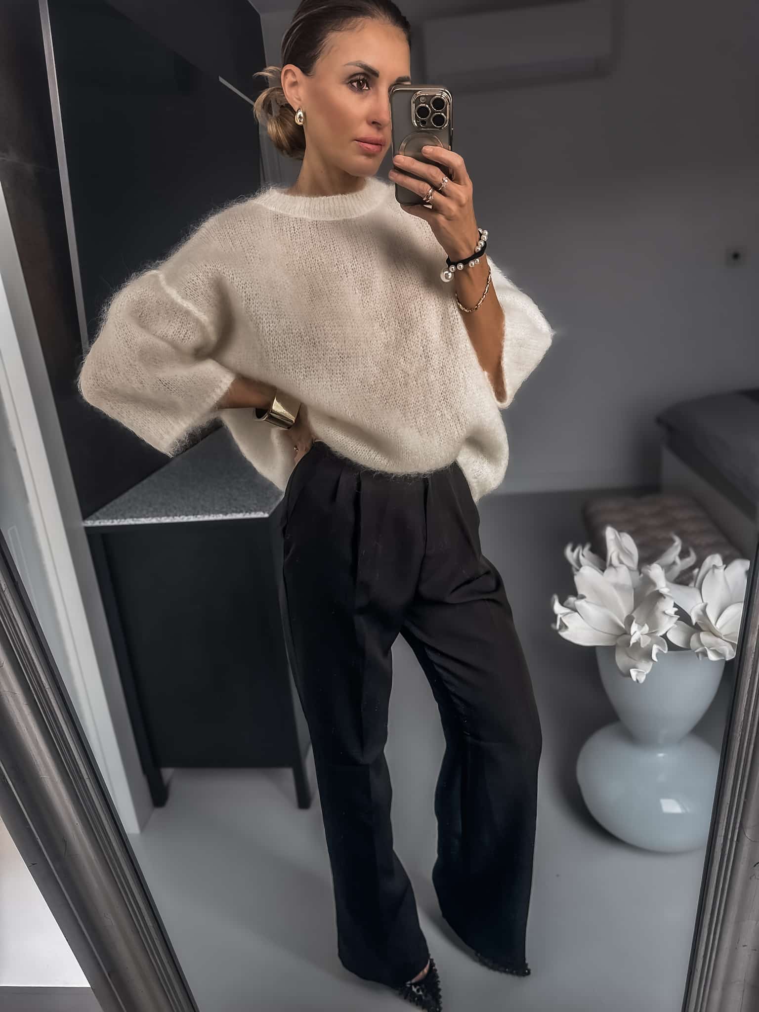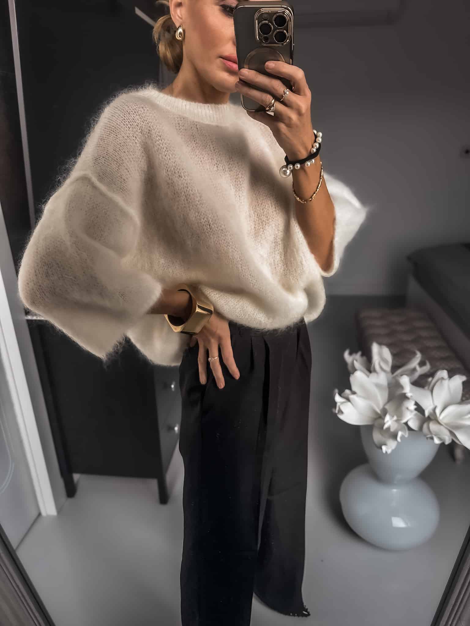 Sweterek wełny kid moher grubszy ciepły fason luźny Jest dłuższy za pupę nie mechaci się jest cudownie puszysty i bardzo miękka sweterek nie gryzie jest miły dla skóry oraz wygodny idealny do jeansów lub spódnic i na święta kolor ecru fason oversize