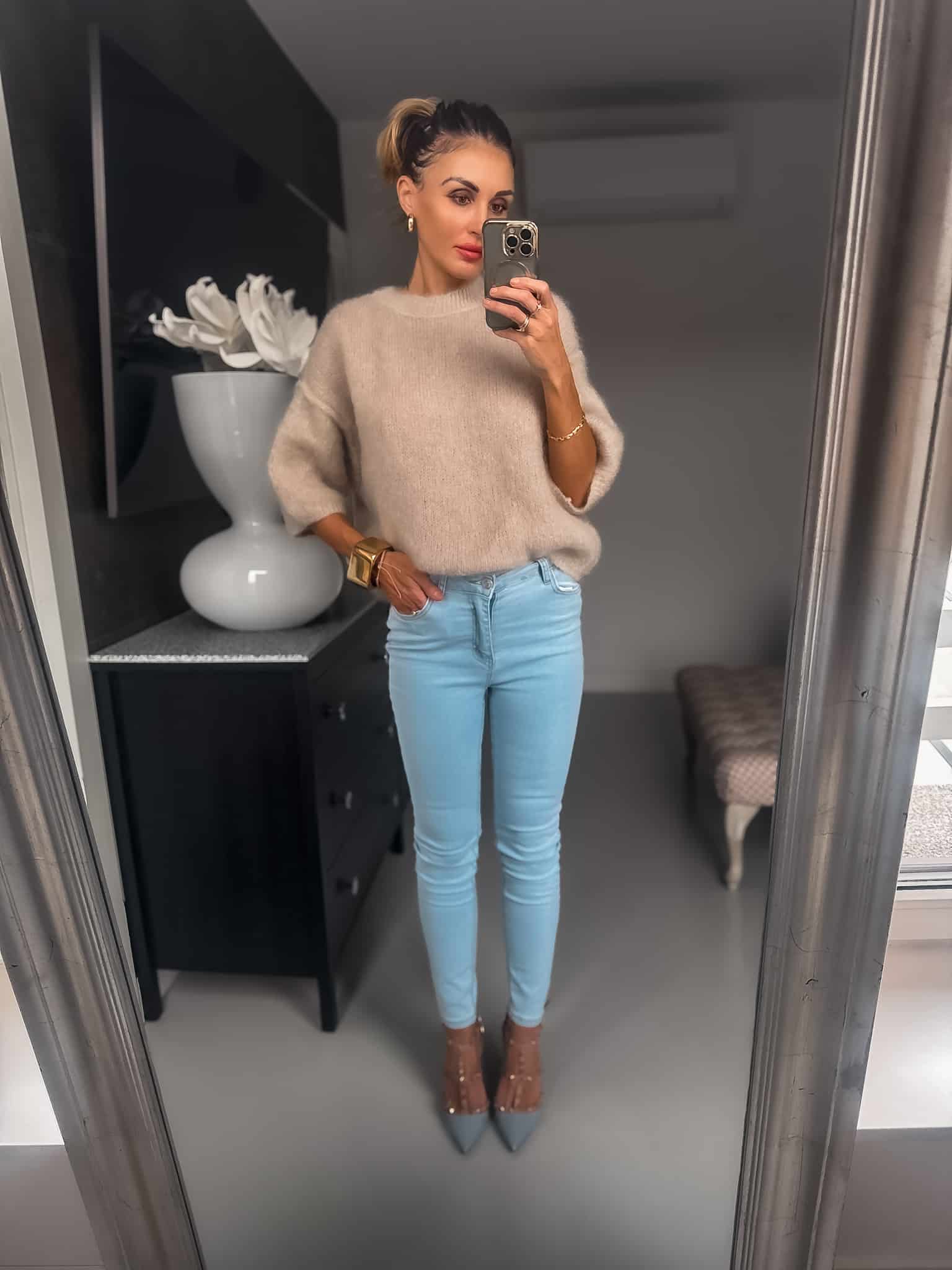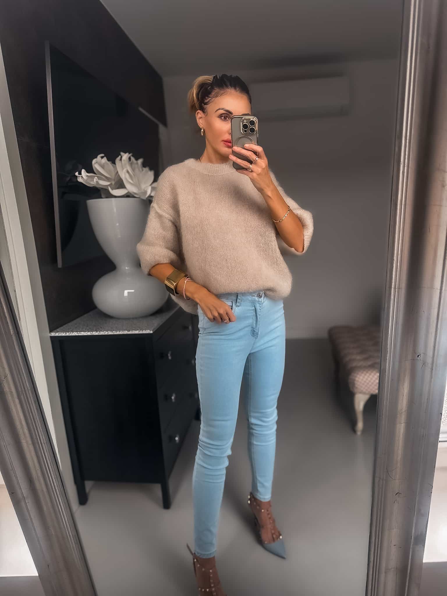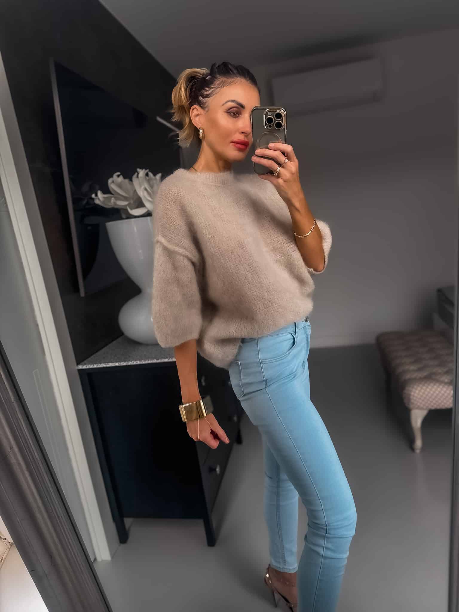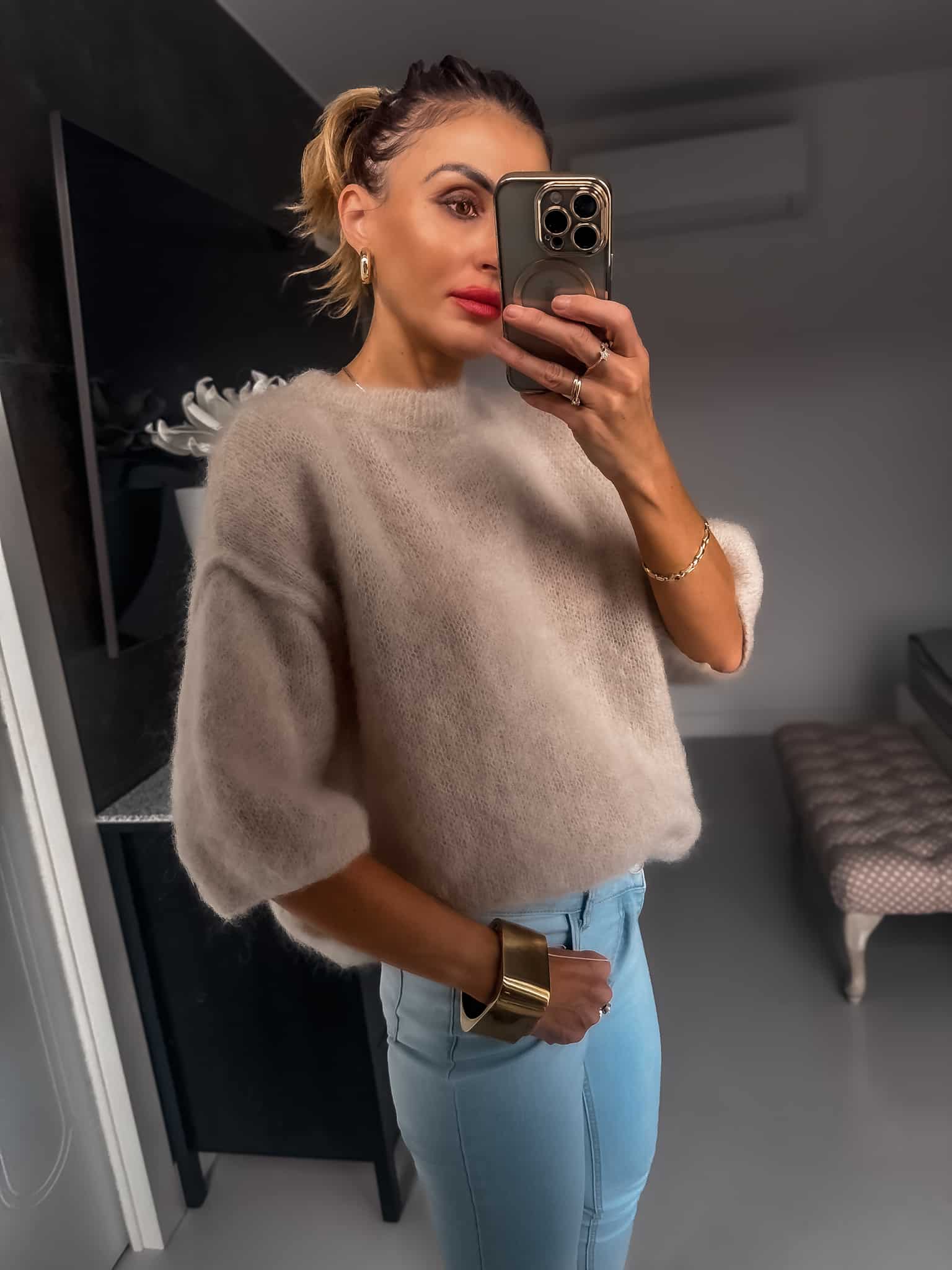 Sweterek wełny kod moher grubszy ciepły fason luźny Jest dłuższy za pupę nie mechaci się jest cudownie puszysty i bardzo miękka sweterek nie gryzie jest miły dla skóry oraz wygodny idealny do jeansów lub spódnic i na święta kolor jasny beżowy fason oversize