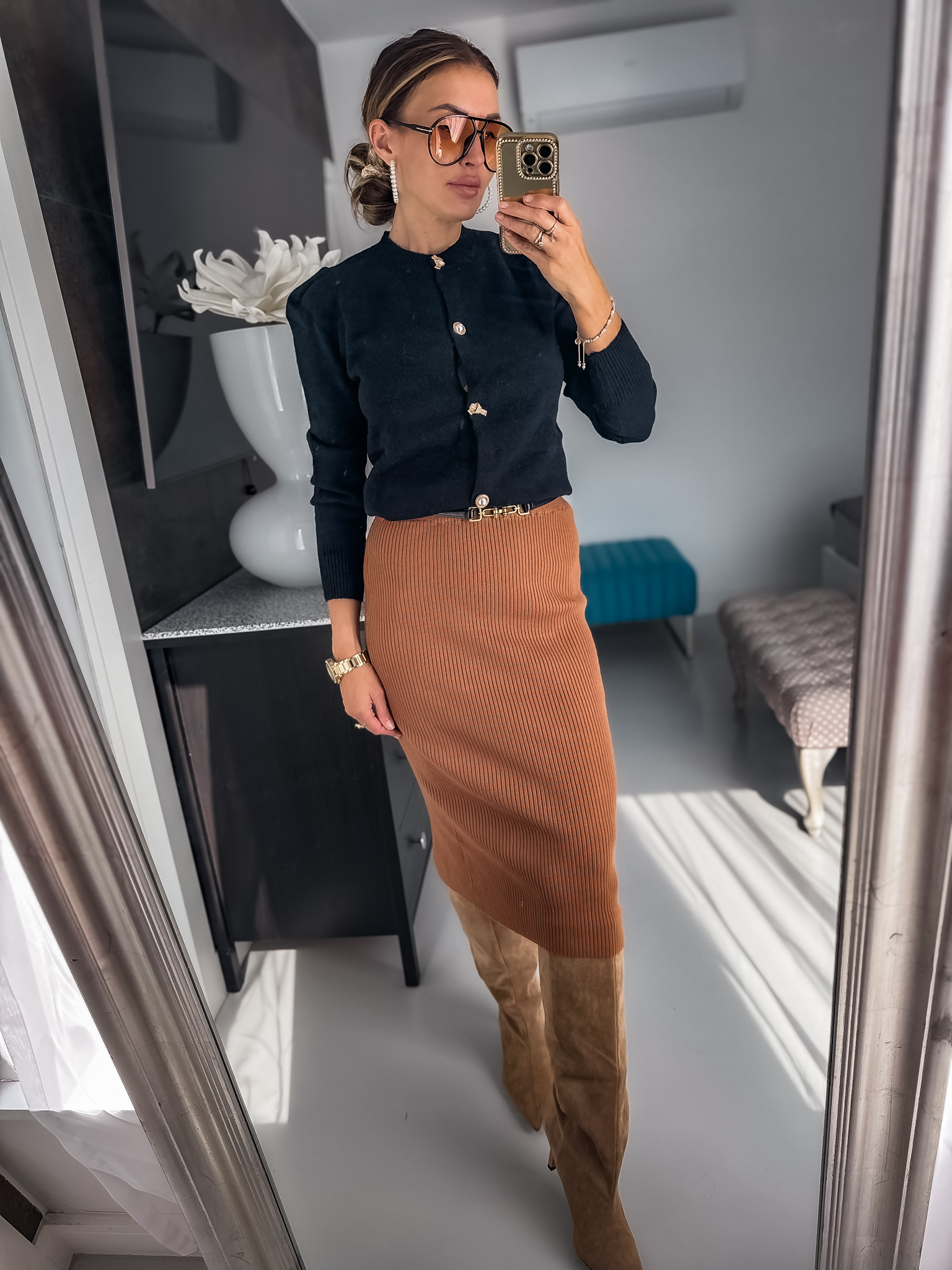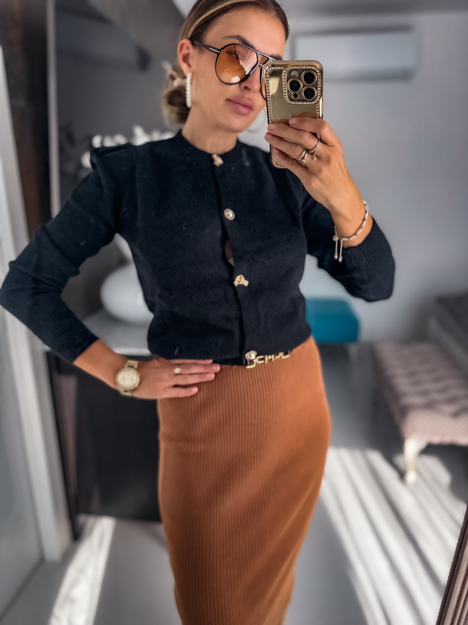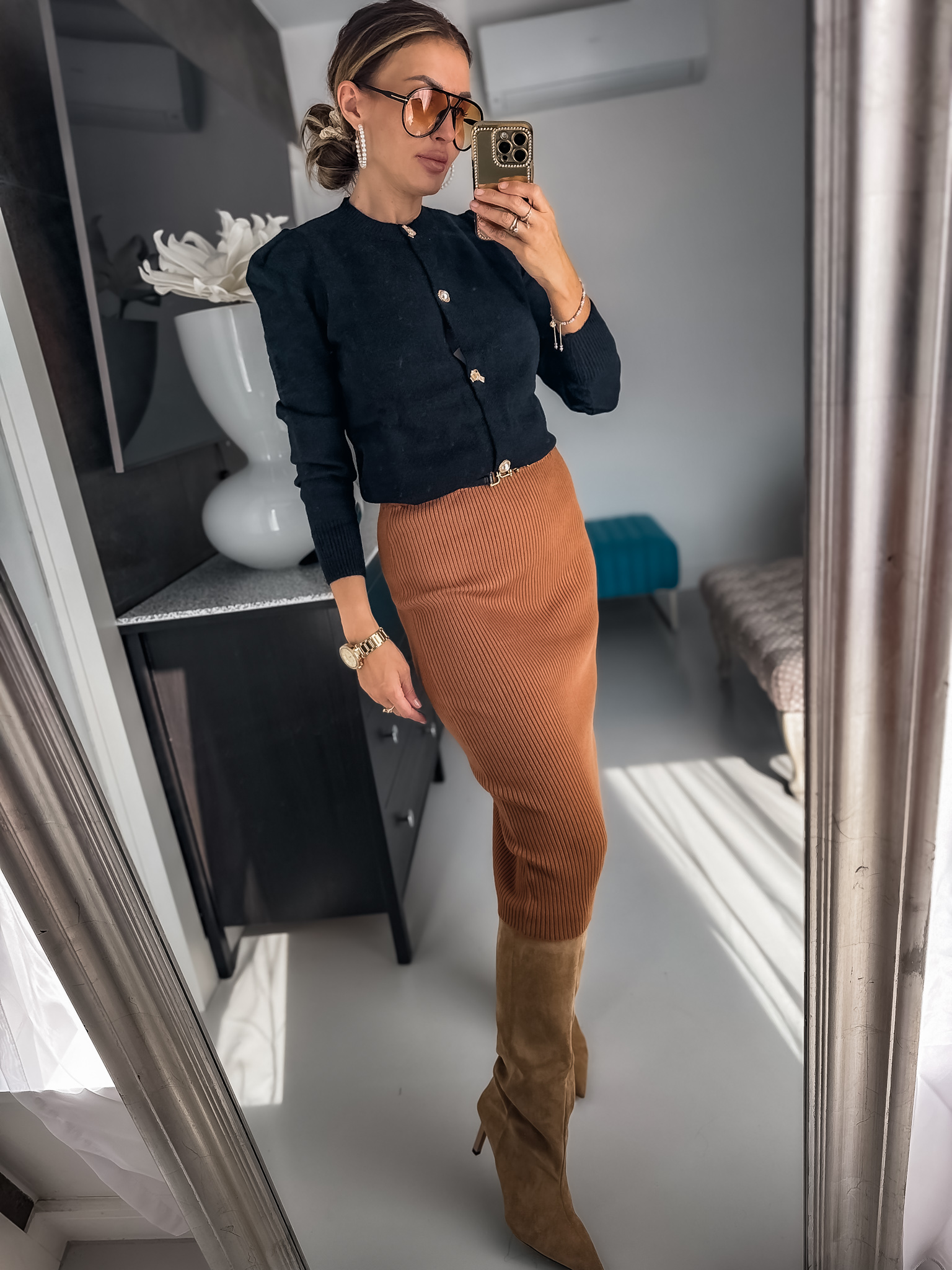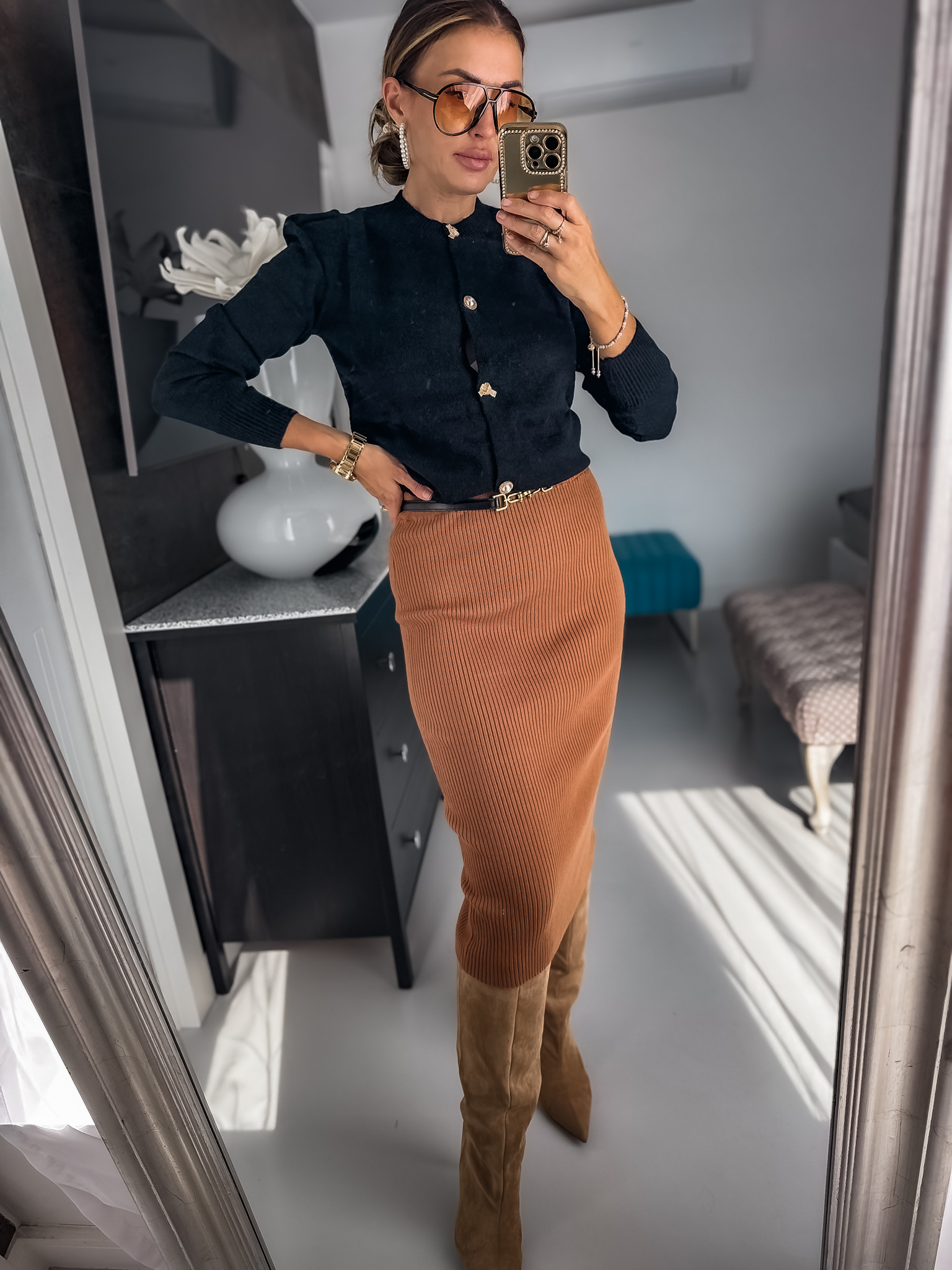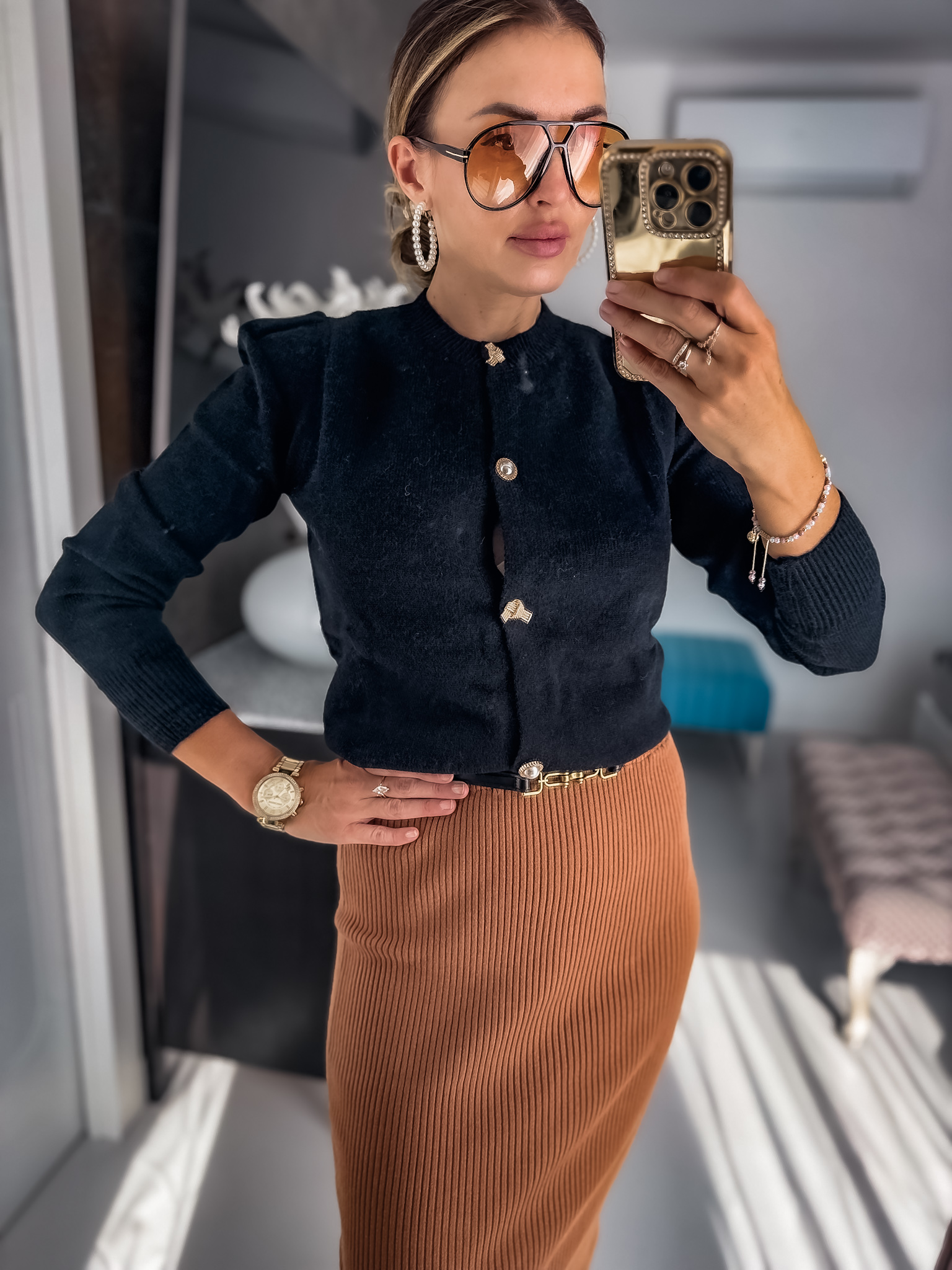Sweterek rozpinany ma śliczne guziczki złote a każdy jest inny delikatny i grubszy zbity materiał bardzo dobry gatunkowo wygląda prześlicznie do wielu stylizacji nie gryzie
